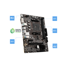 La MSI A520M-A PRO es una placa madre de formato micro-ATX diseñada para ofrecer una plataforma estable y eficiente para procesadores AMD Ryzen con socket AM4, especialmente indicada para entornos de trabajo, oficinas y usos productivos que no requieren overclock agresivo. Incorpora el chipset AMD A520, que ofrece una solución más económica y energética, pero confiable. Tiene un diseño de energía digital con Core Boost para un soporte adecuado de múltiples núcleos, un PCB con cobre de 2 onzas para mejorar la disipación térmica, y tecnologías como DDR4 Boost para optimizar la señal de memoria.