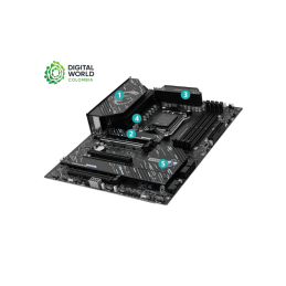 Incluye varias ranuras M.2 (una de ellas compatible con PCIe 5.0), puertos SATA, ranuras PCIe avanzadas (incluyendo PCIe 5.0) y un sistema de energía robusto para mantener estabilidad bajo cargas altas. También tiene características para facilitar el ensamblaje, como clips “EZ” para M.2 y PCIe, y botones para Flash BIOS y Clear CMOS.