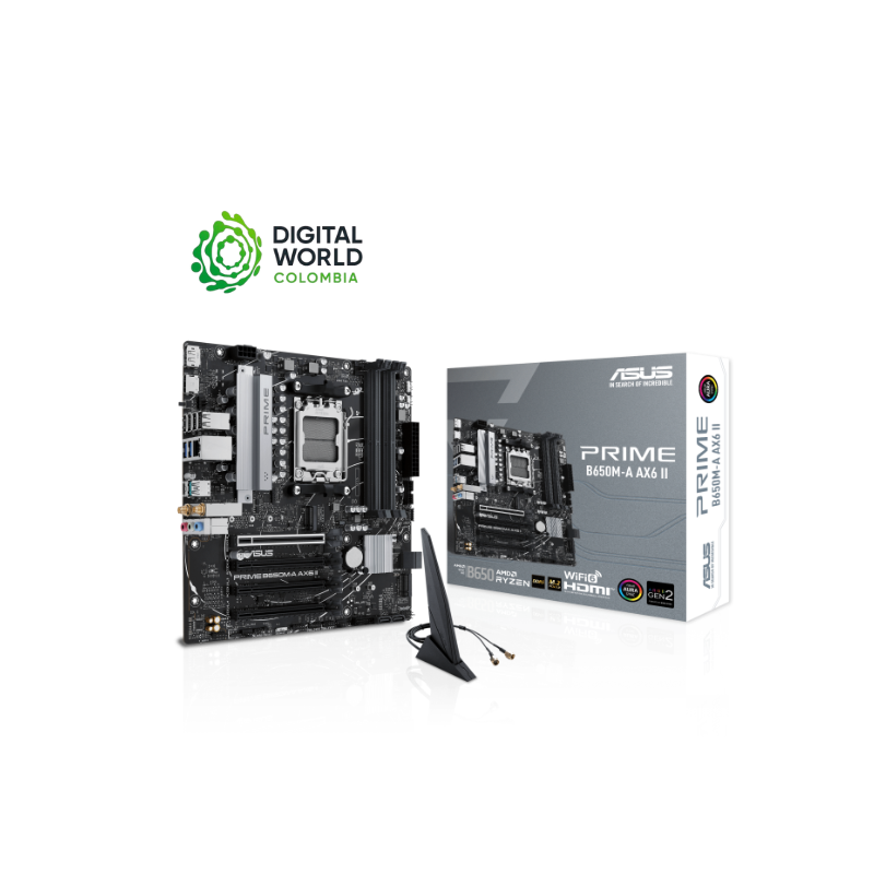 La ASUS PRIME B650M-A AX6 II WiFi es una placa madre Micro-ATX con socket AM5, diseñada para procesadores AMD Ryzen de las series 7000 / 8000 / 9000. Usa el chipset B650, ofreciendo un equilibrio entre rendimiento, conectividad y modernidad. Permite memoria DDR5 con perfiles EXPO™ y cuenta con un diseño optimizado para overclock de RAM gracias a la tecnología OptiMem II.