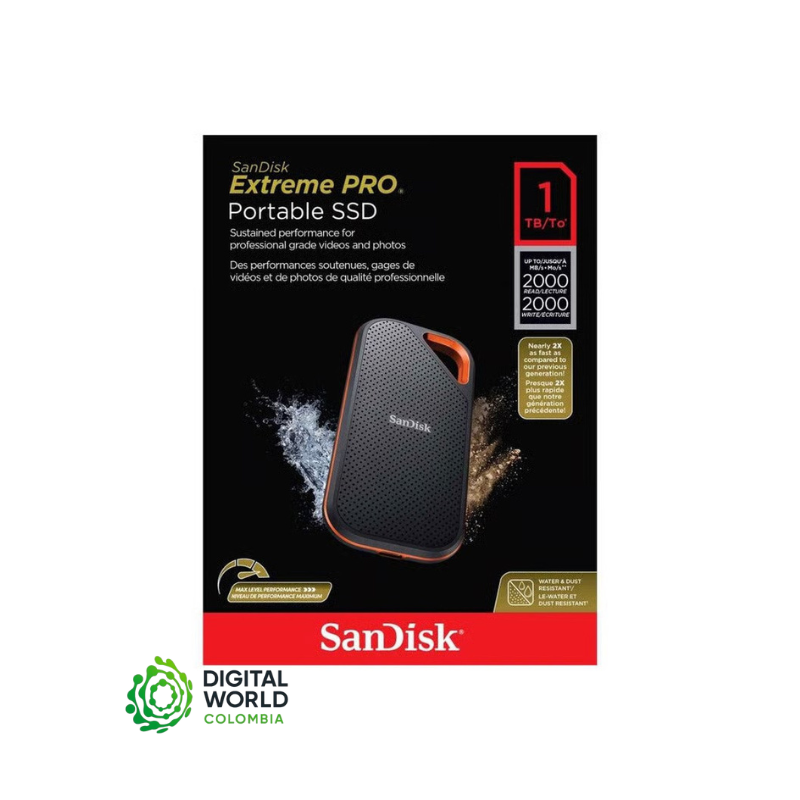 El SanDisk Extreme PRO Portable SSD 1 TB (SDSSDE81-1T00-G25) es una unidad de estado sólido externa de alto rendimiento, diseñada para profesionales que requieren velocidad y fiabilidad. Con velocidades de lectura y escritura de hasta 2000 MB/s gracias a su interfaz USB 3.2 Gen 2×2 y tecnología NVMe, es ideal para transferir grandes volúmenes de datos, edición de video en 4K y copias de seguridad rápidas. Su diseño robusto incluye resistencia al agua y al polvo con clasificación IP55, protección contra caídas de hasta 3 metros y un chasis de aluminio que actúa como disipador térmico. Además, ofrece cifrado de hardware AES de 256 bits para proteger tus datos.