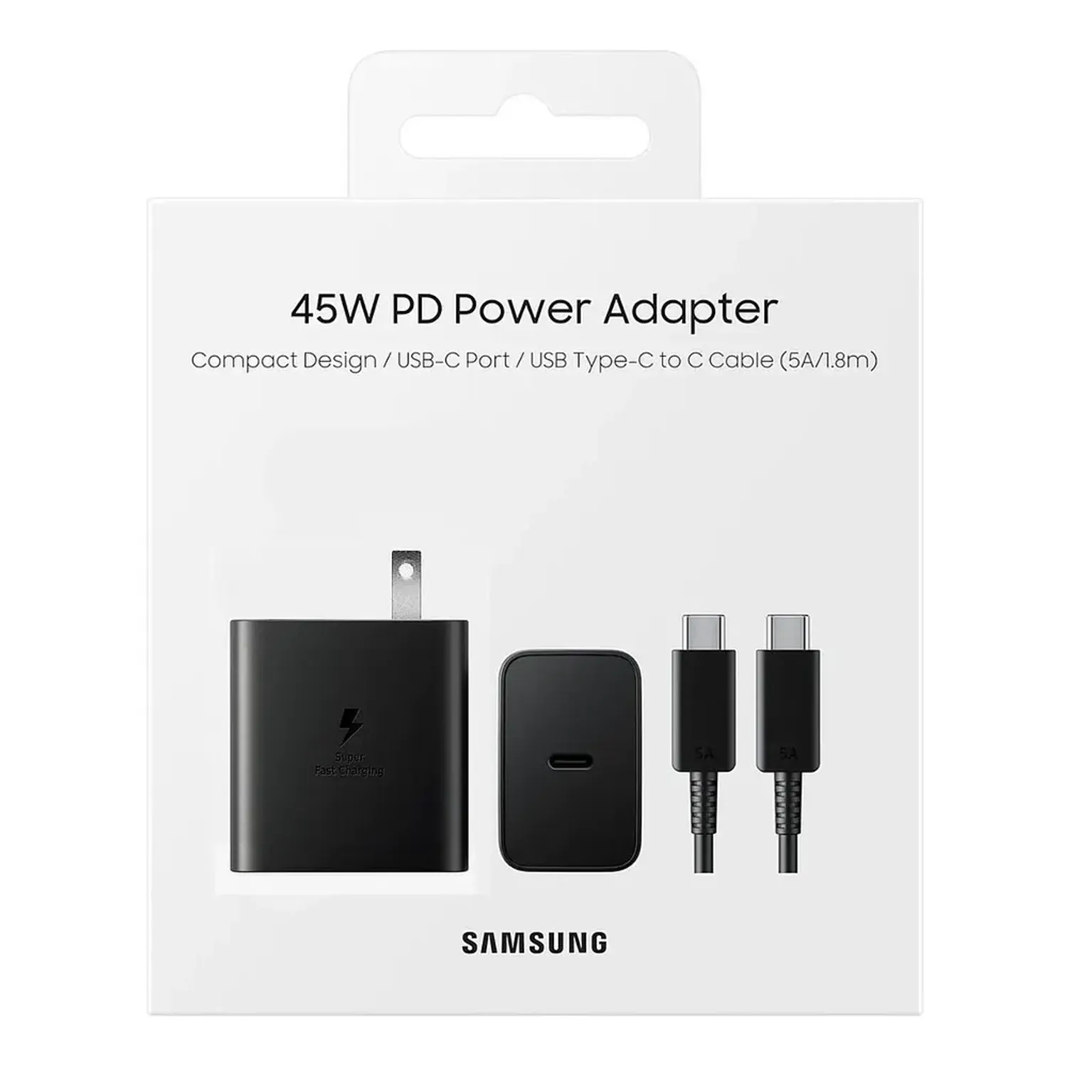 Cargador original Samsung de 45 W con conector USB Tipo-C a USB Tipo-C, compatible con carga rápida Super Fast Charging 2.0 y USB Power Delivery (PD) 3.0. Ideal para smartphones Galaxy (S, Note, Z), tablets y otros dispositivos que admiten 45 W, proporcionando carga segura y eficiente. Incluye cable USB-C 5A para superar 45 W de potencia, y protección interna contra sobrecarga, sobrevoltaje y cortocircuitos.