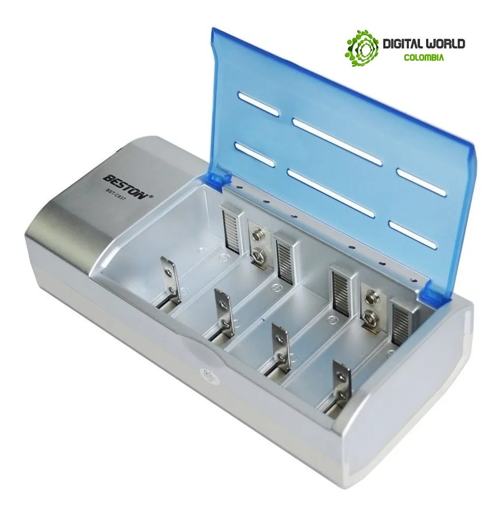 El Cargador Beston C821BW Universal es un cargador de baterías recargables diseñado para múltiples formatos (AA, AAA, C, D y 9 V), ideal para uso doméstico o de oficina. Permite cargar simultáneamente hasta cuatro pilas AA/AAA/C/D o dos baterías de 9 V, con ranuras independientes, lo que te da flexibilidad según el tipo y la cantidad de baterías que necesites energizar.
